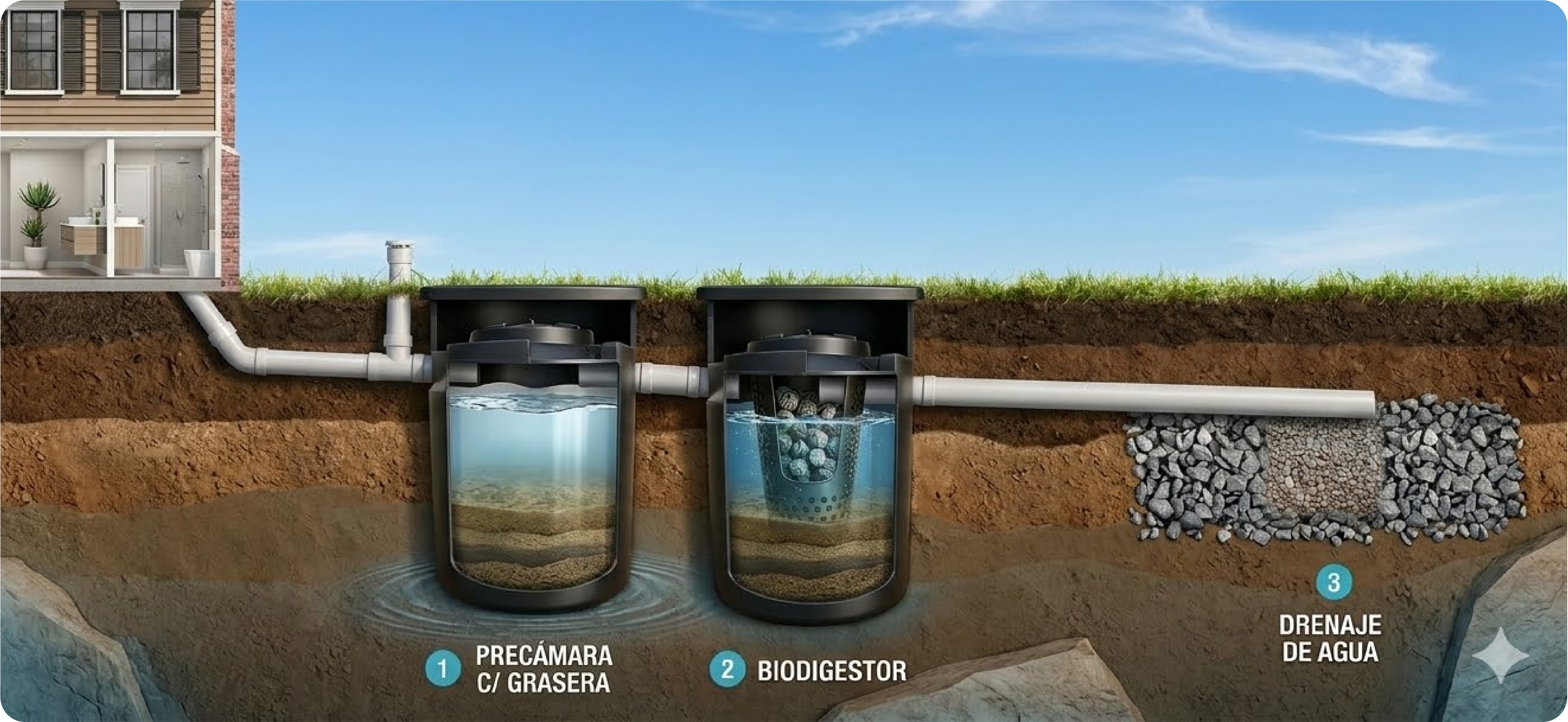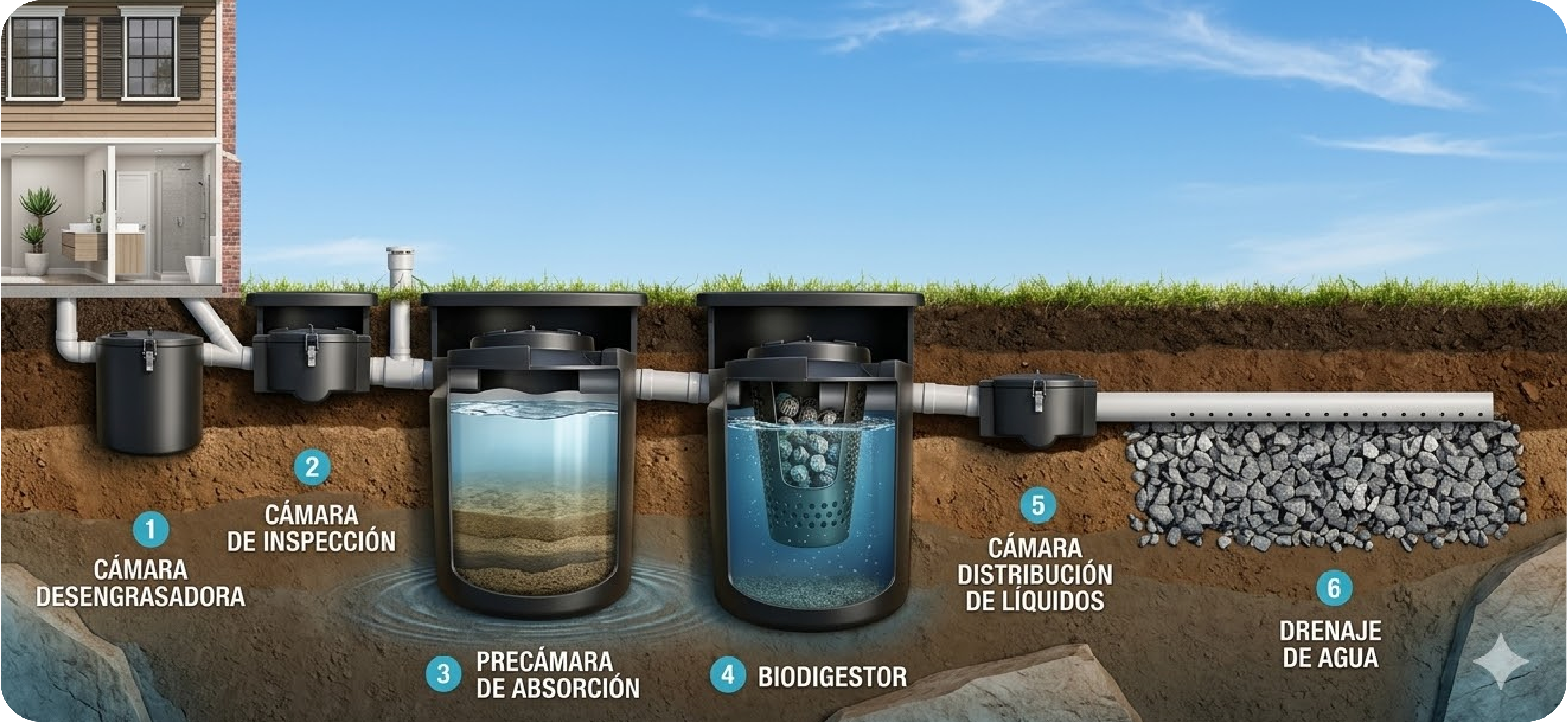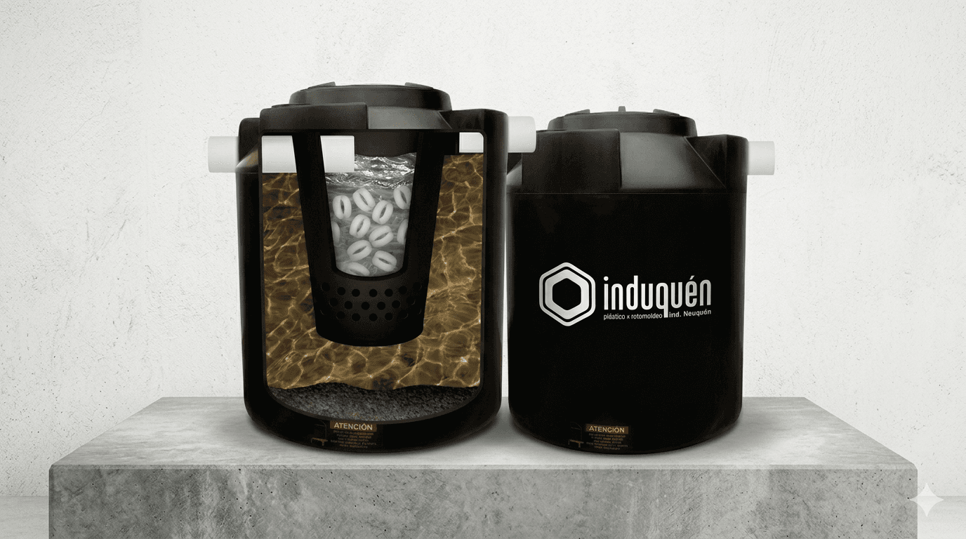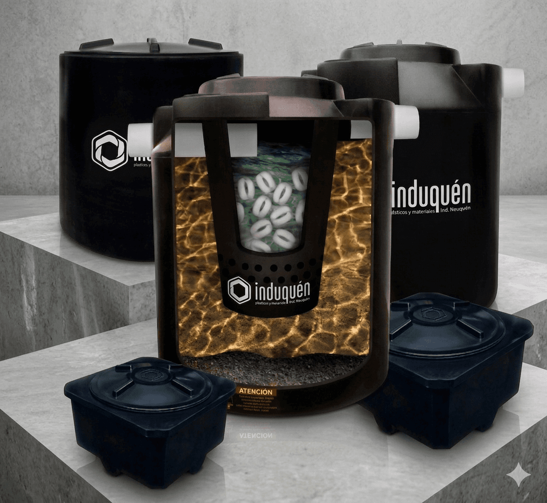 Sistema eficiente de tratamiento de aguas residuales para zonas sin cloacas, que protege napas y ríos. Apto para recibir aguas de baños, cocinas y lavaderos en viviendas, oficinas o industrias. El proceso incluye una etapa inicial de decantación seguida de un tratamiento anaeróbico, donde bacterias degradan la materia orgánica y descomponen los sólidos. Incorpora un biofiltro plástico que retiene sólidos en suspensión, evitando su salida y prolongando la vida útil del sistema de absorción. Incluye 5 cámaras.